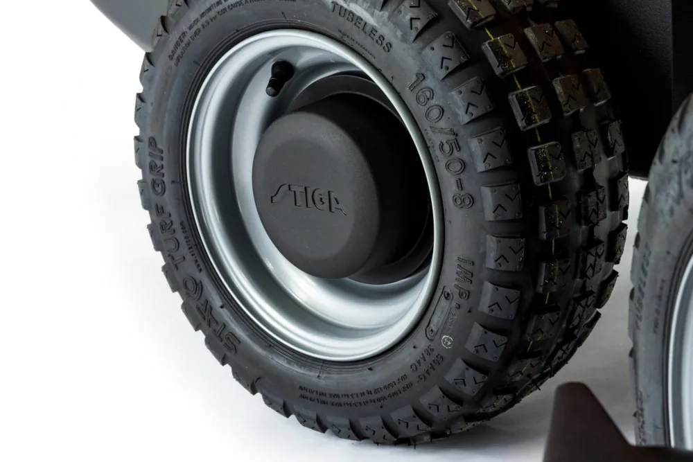 Das robuste Hydrostatgetriebe ermöglicht eine stufenlose Fahrgeschwindigkeit durch das Anpassen des Pedaldrucks. Die Einstellung der Schnitthöhe erfolgt beim Stiga Combi 95 Q plus Mähwerk elektrisch vom Fahrersitz.